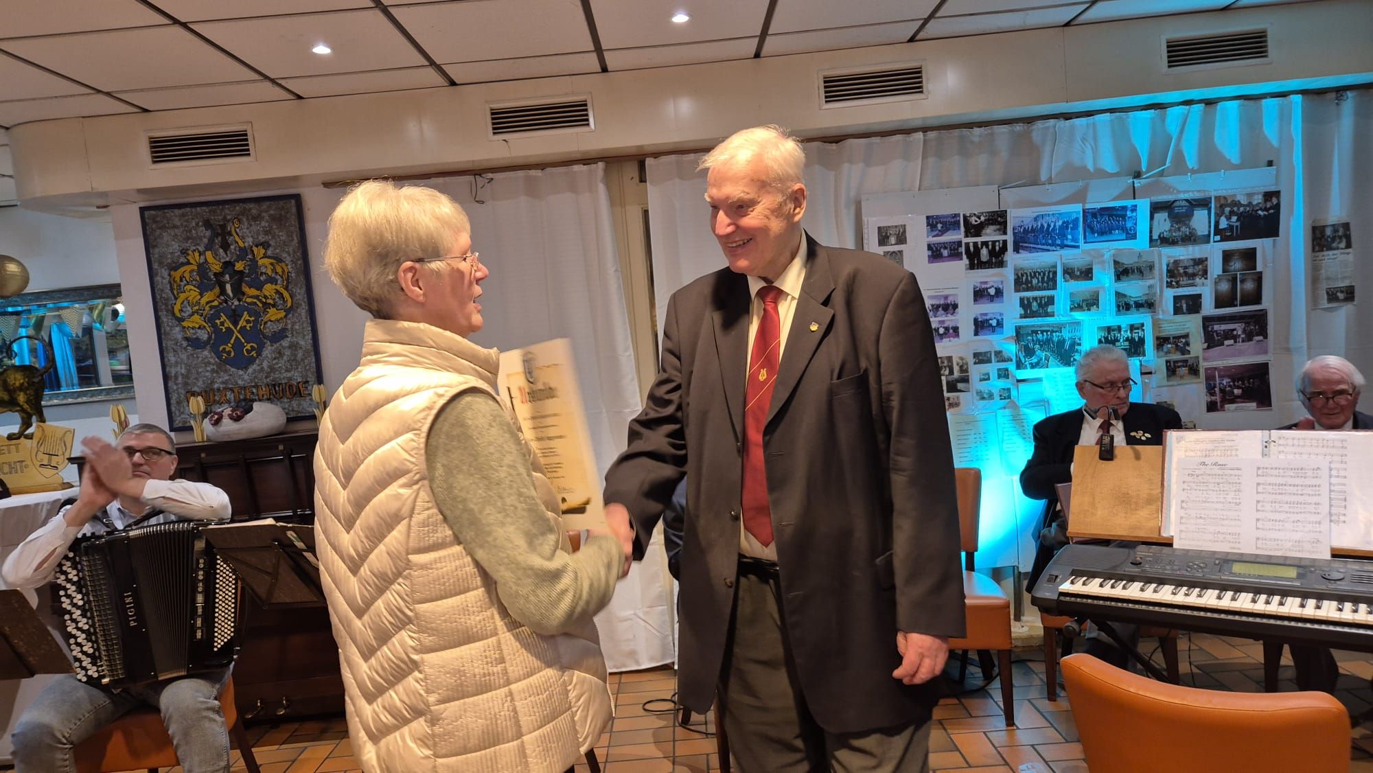Damit hatte er nicht gerechnet. Hans-Ulrich Angerstein wurde für 25 Jahre aktives Singen mit einer Urkunde und Anstecker in Silber geehrt.