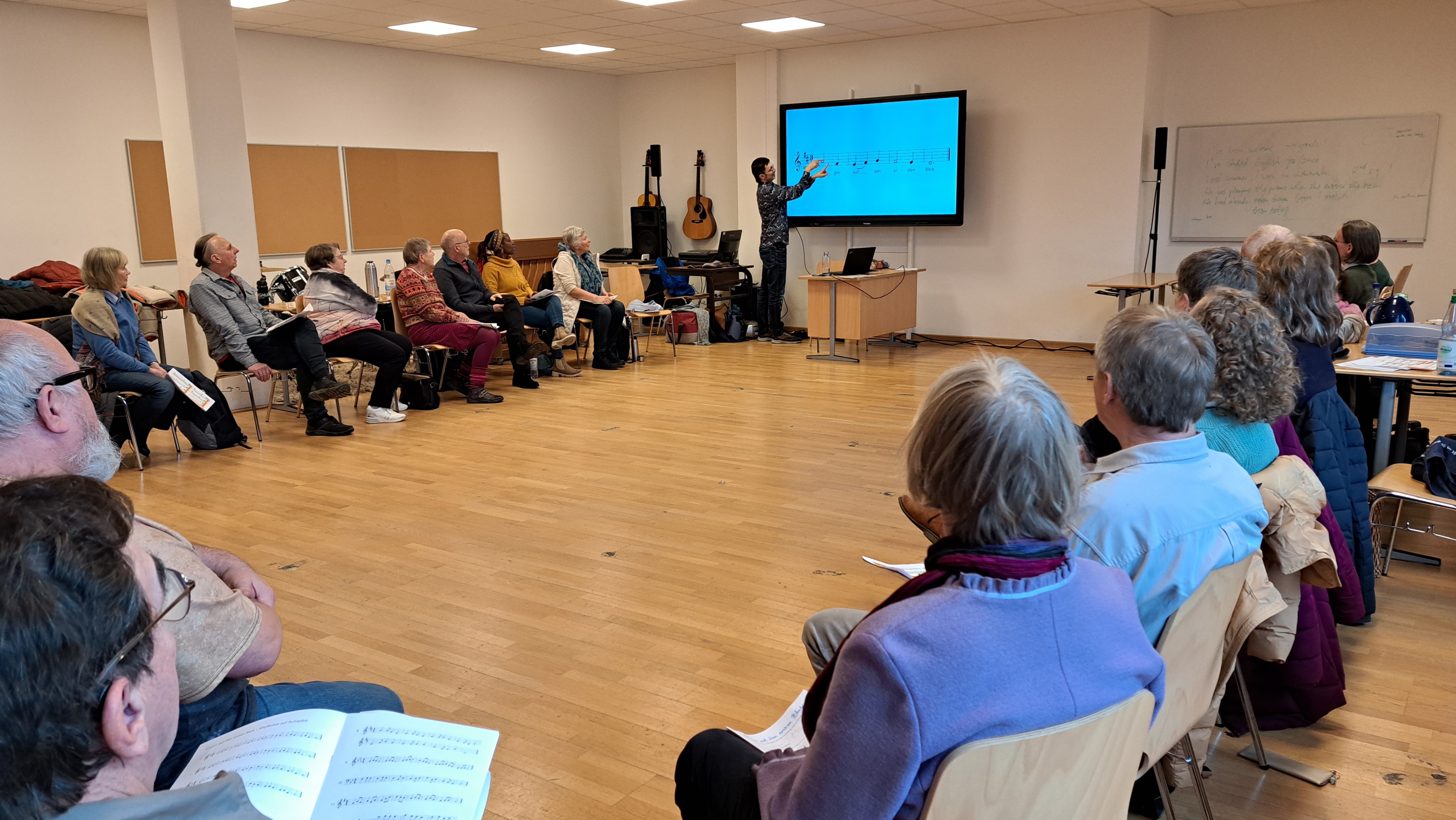 In einem ganztägigen Workshop unter der Leitung von Martin Sturm aus Berlin erarbeiteten sich die Teilnehmer, angefangen von den ersten Schritten im Notenlesen, die wichtigsten Grundlagen im Vom-Blatt-Singen. Zum Schluss konnte bereits ein zweistimmiges Lied allein aus den Noten erschlossen werden. Motiviert von häufigem Lob des Dozenten hatten alle Sängerinnen und Sänger viel Freude.